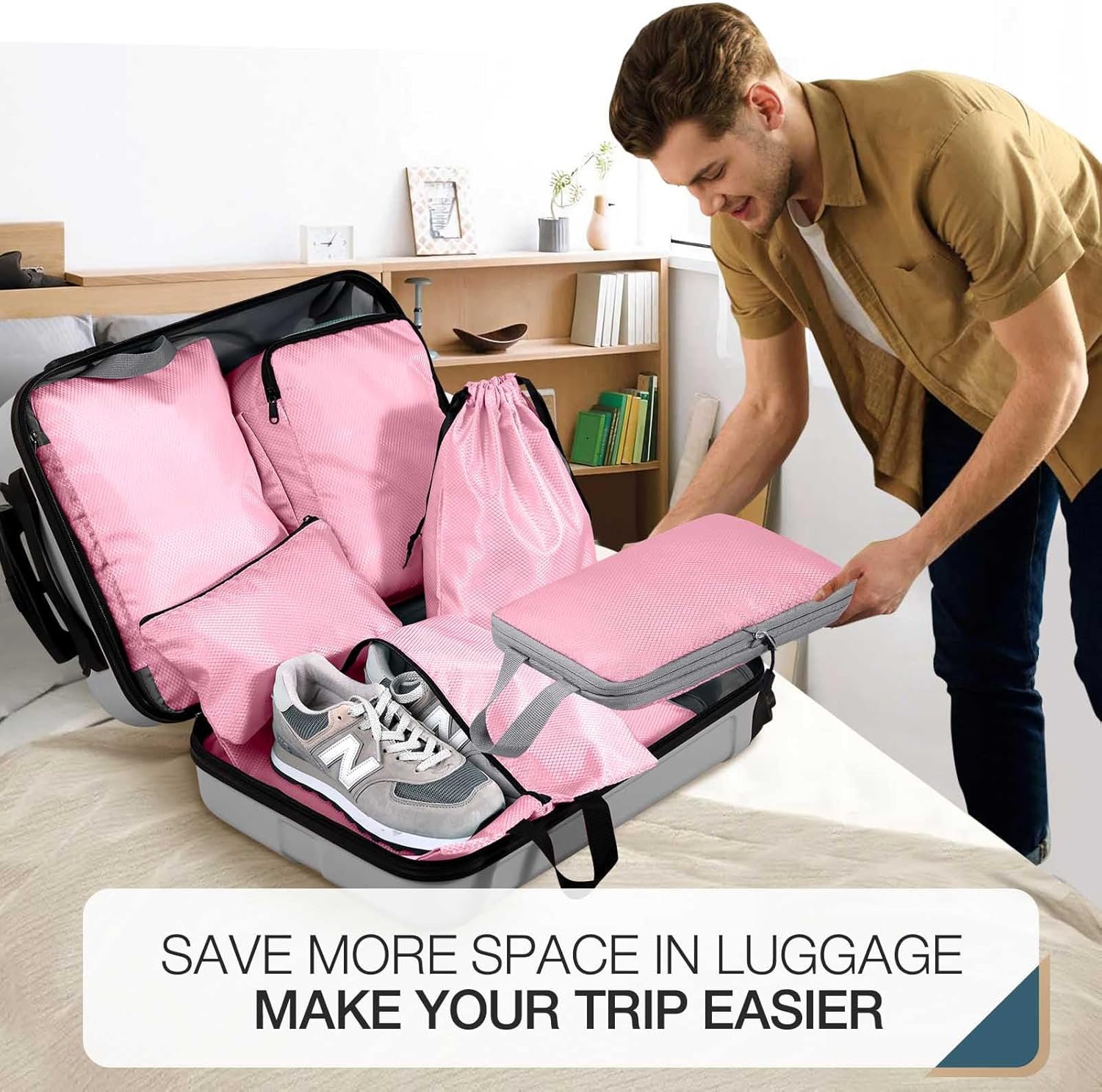 With these packing cubes, you can say goodbye to the chaos of an overstuffed suitcase and hello to effortless organization. The set includes cubes of various sizes to accommodate all your essentials, from clothing and accessories to toiletries and gadgets. Each cube is crafted from durable, lightweight materials that compress easily to maximize space in your luggage.